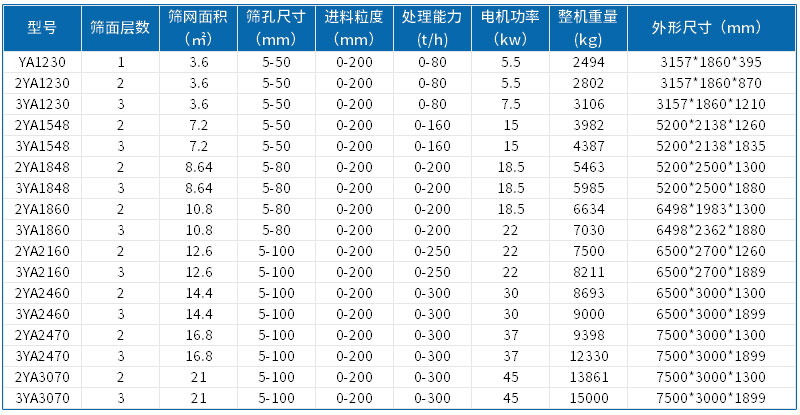 隆中圓振動篩主要由篩箱、篩網(wǎng)、振動器及減振彈簧等組成。如無特殊要求,YA和2YA型為紡織篩面,YAH型為沖孔篩面,各類篩面均能滿足。