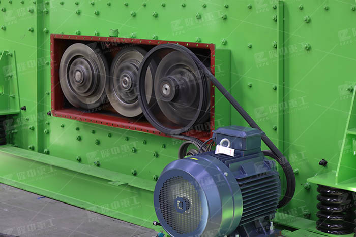 三軸橢圓篩的激振器是由三根并列的振動軸組成,位于篩箱一側(cè)的振動軸的一端裝有速比為1的互相嚙合的三個齒輪; 振動篩工作時,電機皮帶傳動裝置帶動激振器的三個齒輪旋轉(zhuǎn),由于三根軸上均裝有相等的偏心質(zhì)量、相同的偏心半徑的配重盤,由等參數(shù)的齒輪同步連接,因此篩箱的運動軌跡呈現(xiàn)為橢圓形,即單軸振動篩的圓運動軌跡和雙軸振動篩的直線運動軌跡的合成運動軌跡。橢圓的運動軌跡可以使物料擁有更大的運行速度,提高設(shè)備的產(chǎn)量。
